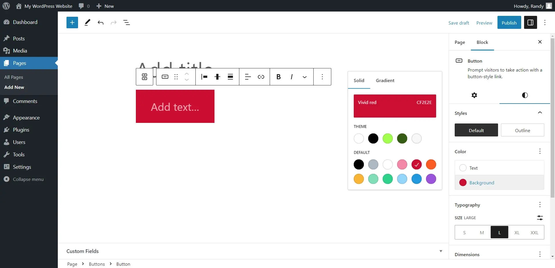 The example below is from the WordPress Gutenberg editor. It includes tools to place and style all types of graphical elements. I’ve added a button and adjusted the font size, font color, and background color using the Gutenberg tools.