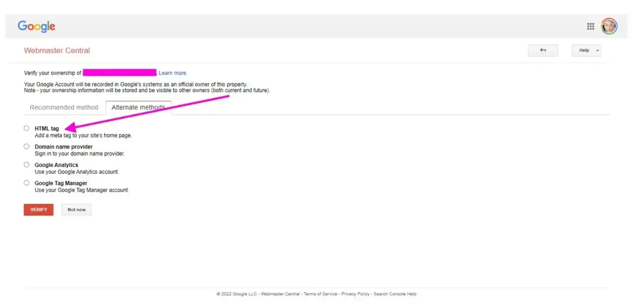 Once on the Webmaster Central, choose the HTML tag method.