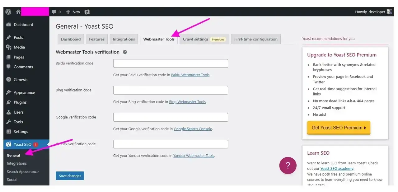 - Go to Webmaster Tools tab in Yoast SEO’s General Settings
