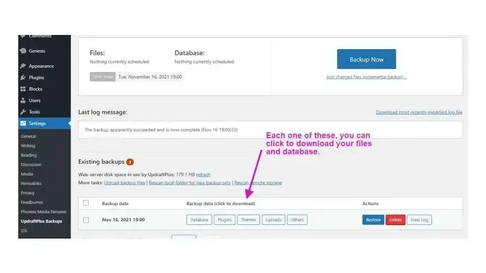 Please note that if the website has a lot of images, the backup may take longer to complete. In that case, just leave the window to the UpdraftPlus dashboard open, so it continues to generate a backup. You can go read a movie, surf social media in another browser window, or do something else, so you’re not stuck waiting for your backup to finish processing.