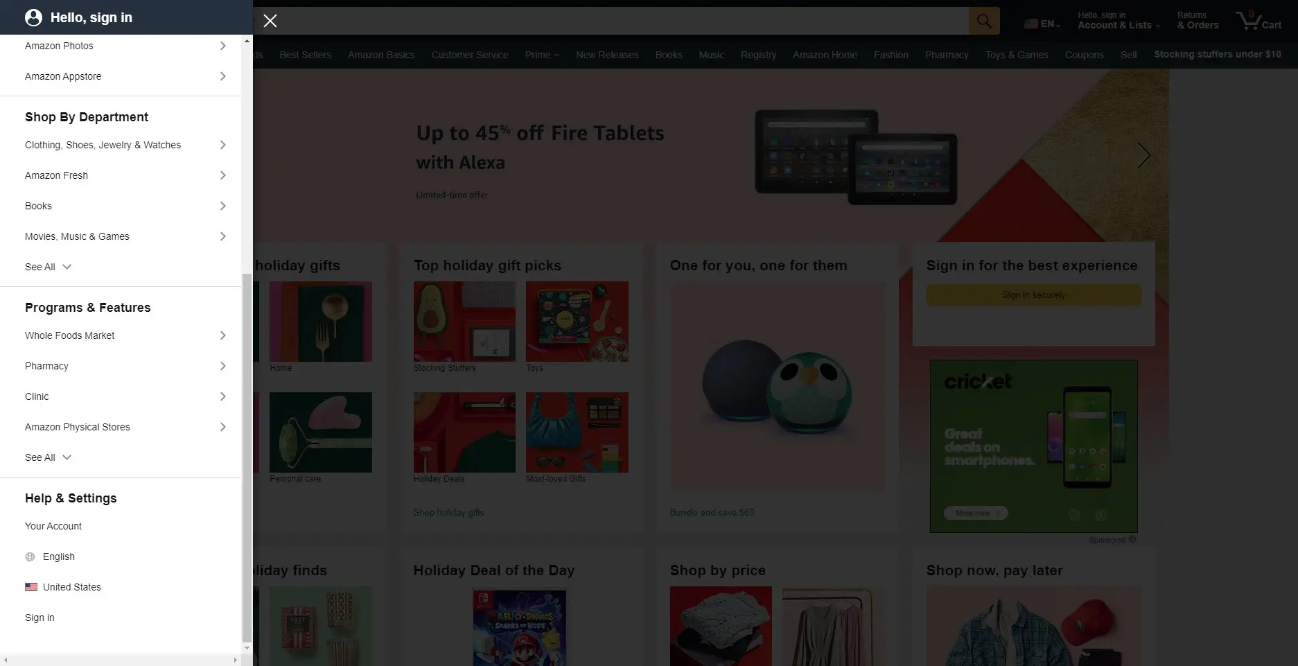 Clicking the hamburger icon opens a larger menu that’s divided into categories.