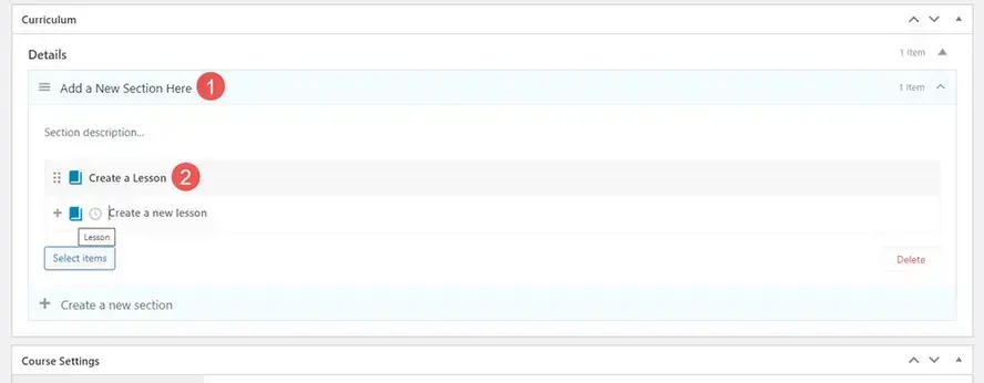 The lessons are created separately. Once you’ve created them, edit the course to connect the lessons to the course. Under Curriculum, add a title in the field labeled Create a new section. This opens a new set of fields where you can add lessons and quizzes.