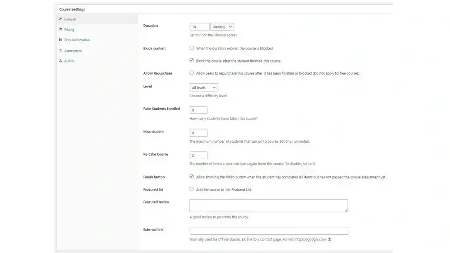 Under Curriculum are the Course Settings. This includes General Settings, Pricing, Extra Information, Assessment, and Author. These are all the settings that are specific to this course.